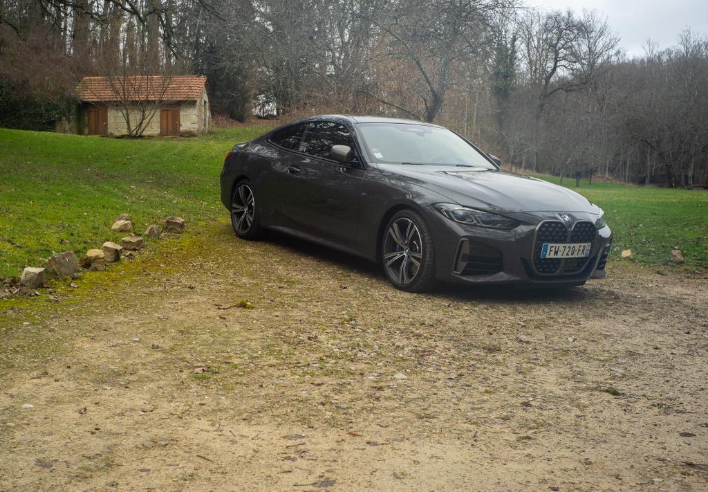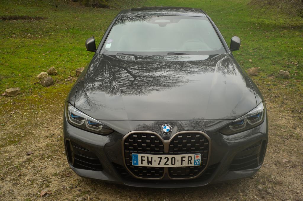 Certes, elle est grande cette calandre, ce « haricot » comme l’appellent les « Bmistes » puristes. Mais à l’examiner de près, il sied plutôt bien à ce coupé M440i. Son embonpoint s’intègre plutôt bien à une ligne générale restée fort classique. Rien à voir avec l’effet ultra-agressif qu’elle donne aux nouveaux SUV de la marque de Munich, où le haricot renforce l’effet « pousse toi là que je m’y mette » que j’observe lorsqu’un X7 récent se profile dans le rétroviseur et que je peine à dépasser les 120km/h sur la file de gauche de l’autoroute avec ma pauvre Twingo 1.