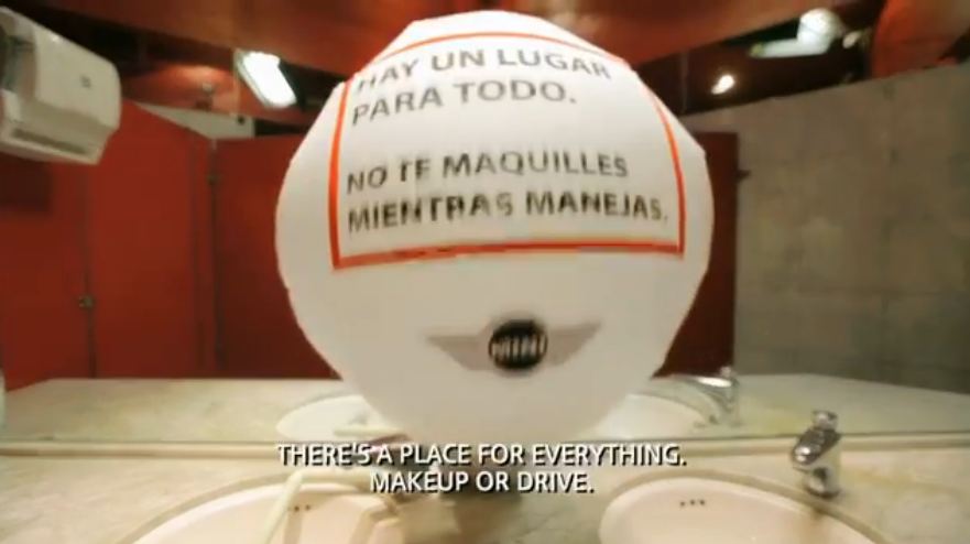 Du coup, une campagne Mini fait exploser les airbags dans les toilettes des dames (endroit privilégié pour se refaire la façade), histoire de nous avertir de ce qu’il peut nous arriver si nous envisageons de sortir le bâton de rouge à lèvre en conduisant…