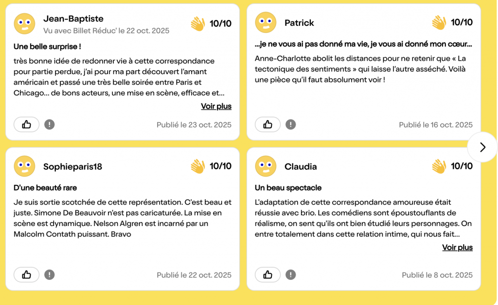Les agents américains n’ayant jamais autorisé la publication des lettres de Nelson Algren, j’ai donc imaginé tout ce qu’il pouvait vivre, ressentir. J’ai infiltré son coeur, son âme, afin d’écrire cette pièce de théâtre aux critiques dithyrambiques afin de donner vie à cette passion amoureuse où l’auteure de l’essai du Deuxième Sexe découvre pour la première fois le plaisir et le Désir !